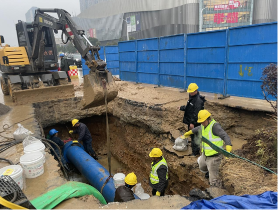 險情就是命令,凌晨1點,公司立即組織10余名搶修人員到場關閘止水。與此同時,技術人員、施工人員和設備設施“跑步前進”、同步到場,對破損溢水點進行邊開挖、邊診斷。為加快搶修速度,減少對周邊用戶的影響,30余名搶修人員頂著嚴寒天氣連夜搶修。