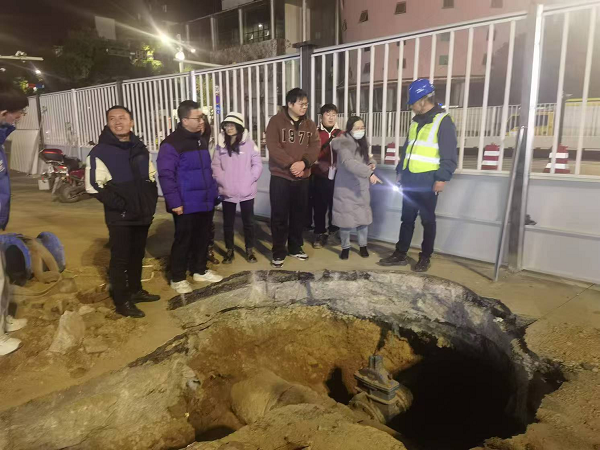 盡管寒風凜冽,施工現場卻是一片繁忙景象,燈火輝煌。挖掘機械設備緊張作業,工人們有序地進行著供水管道連接前的準備工作。設計造價人員仔細觀察,詳細記錄,并不時向現場施工人員和技術人員提出問題,深入掌握施工流程和關鍵技術。
