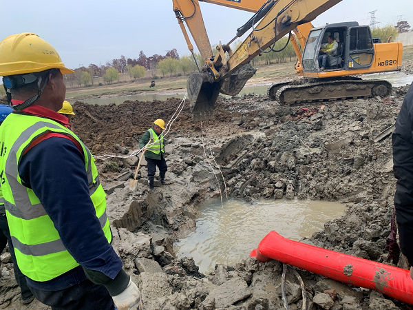 孝感城區向云夢供水的DN1200主管道于2013年建成通水,是供給云夢縣城鄉生產生活用水的唯一通道。由于爆管位置恰處于澴河主河道中央,盡管枯水季水位不高,但管道口徑大、埋深大,現場搶修仍面臨極大的困難。預案啟動后,市住房和城市更新局、澴川國投集團和公司相關負責人第一時間趕到現場調度指揮,會同技術人員現場研判分析,迅速制定了搶修方案。